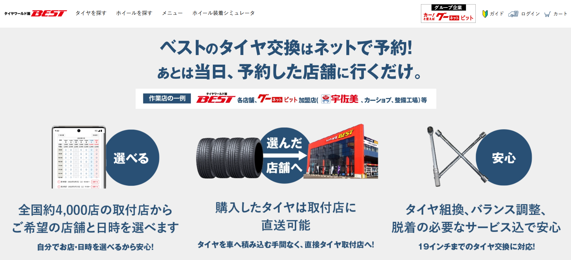 オンラインで商品の購入と同時に取付作業の予約まで完了させることができ、ユーザーは予約日に店舗に行くだけでタイヤ交換が完了します。これにより、自分で重いタイヤを運ぶ手間や、取付店を探す手間を解消しています。