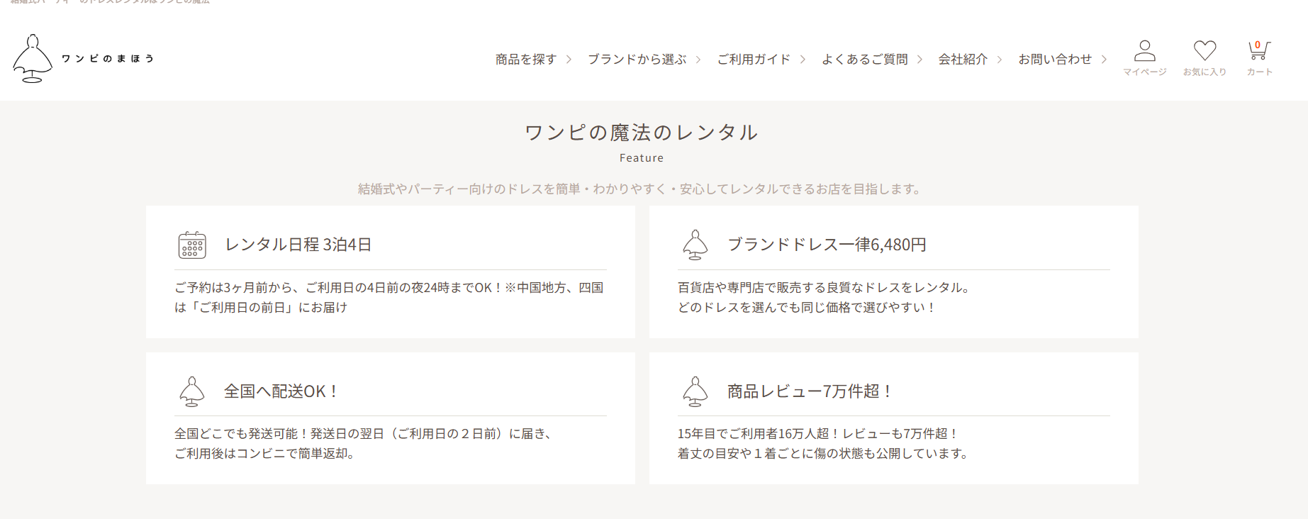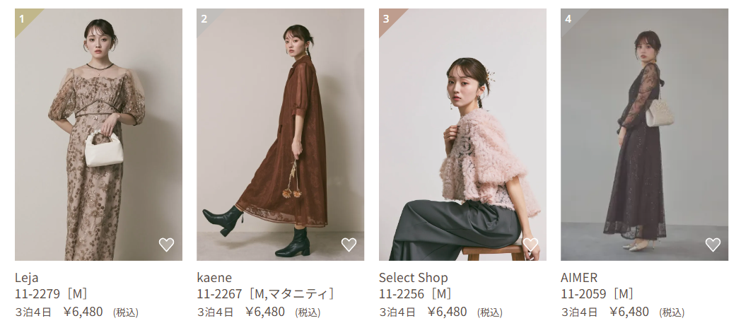 3泊4日のレンタル日程、ドレスALL6,480円でわかりやすいサービス体系