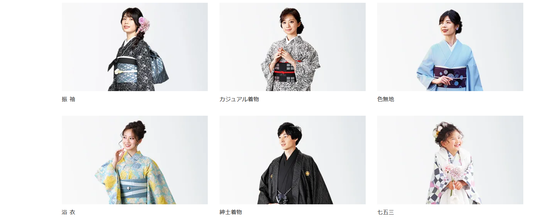 振袖、袴(はかま)、訪問着、七五三の衣装、浴衣、和装小物など、幅広いアイテムを取り揃えています。