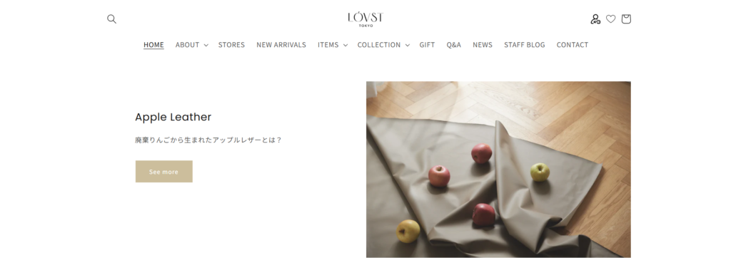 LOVST TOKYOの最大の特徴は、本来捨てられるはずだった副産物を有効活用している点です。代表的な素材で「アップルレザー」は、廃棄予定のリンゴの皮や芯を粉末状に加工し、バイオベースの樹脂と混合して作られています。