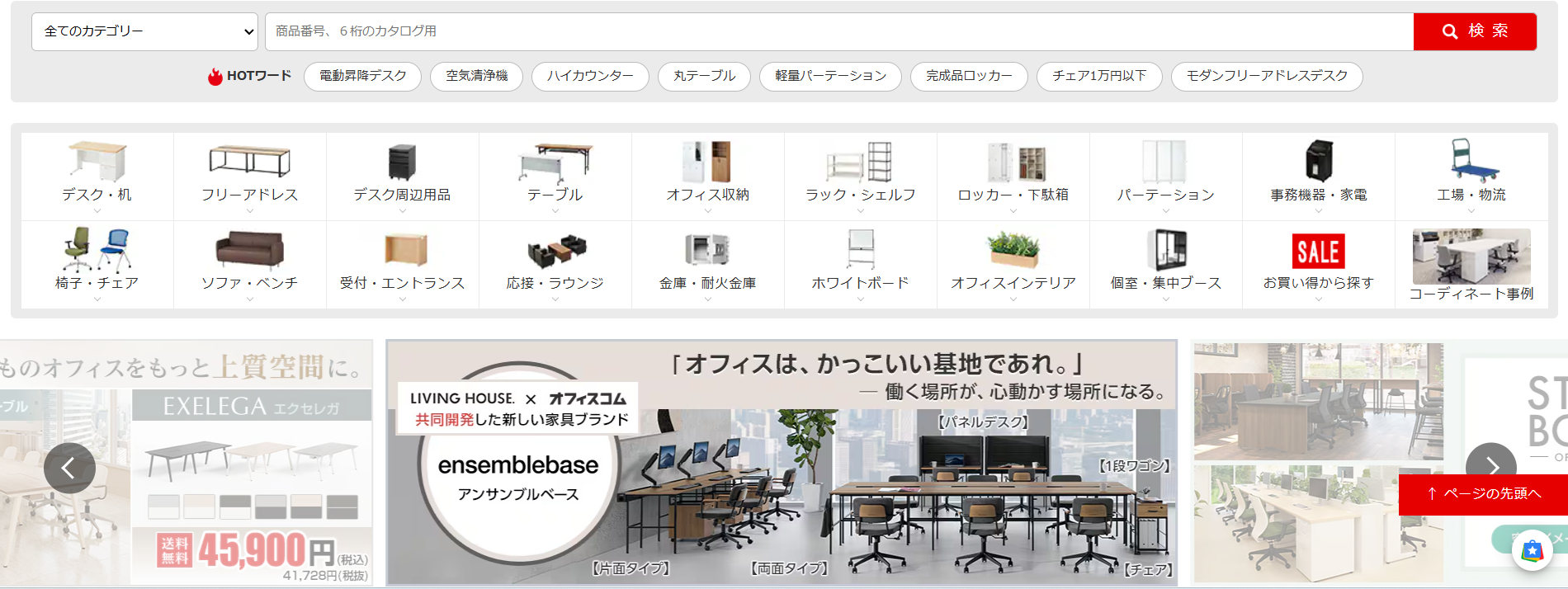 オフィスコムの最大の強みは、オフィスデスクやチェアから、パーテーション、金庫、さらにはOA機器に至るまで、オフィスに必要なものがすべて一箇所で揃う点にあります。